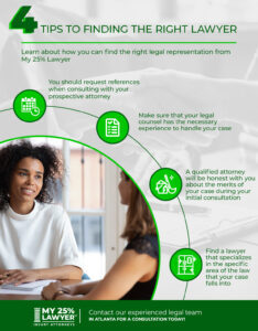 If you need to find an attorney to assist you in a legal situation involving personal injury, it can feel like a daunting task. Not only are you injured, but you then have to jump through complicated legal loopholes in order to get proper compensation for your injury while also dealing with the pain that you sustained during and after the incident. It is imperative that you have trustworthy legal counsel on your side during this process so that you can ensure that you are receiving the proper amount of money that you are owed to cover medical costs and all due compensation for the trauma that you endured. Learn more about finding the right lawyer for your case from the experienced team at My 25% Lawyer below and reach out to our team for a consultation regarding legal representation today.